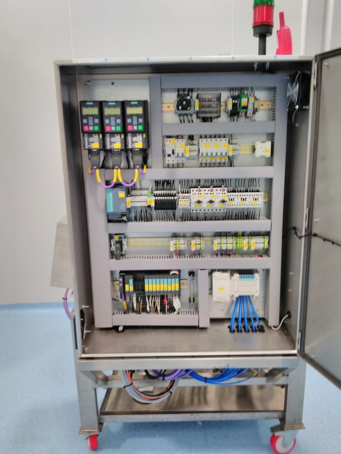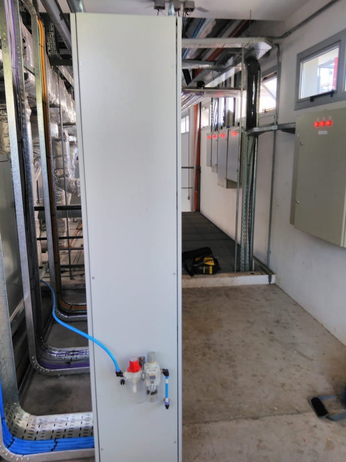 El trabajo incluyó el armado y montaje del tablero de control y potencia, conexionado de la totalidad de la instrumentación, válvulas, pantallas de operación; tendido y conexionado de tubing neumático.